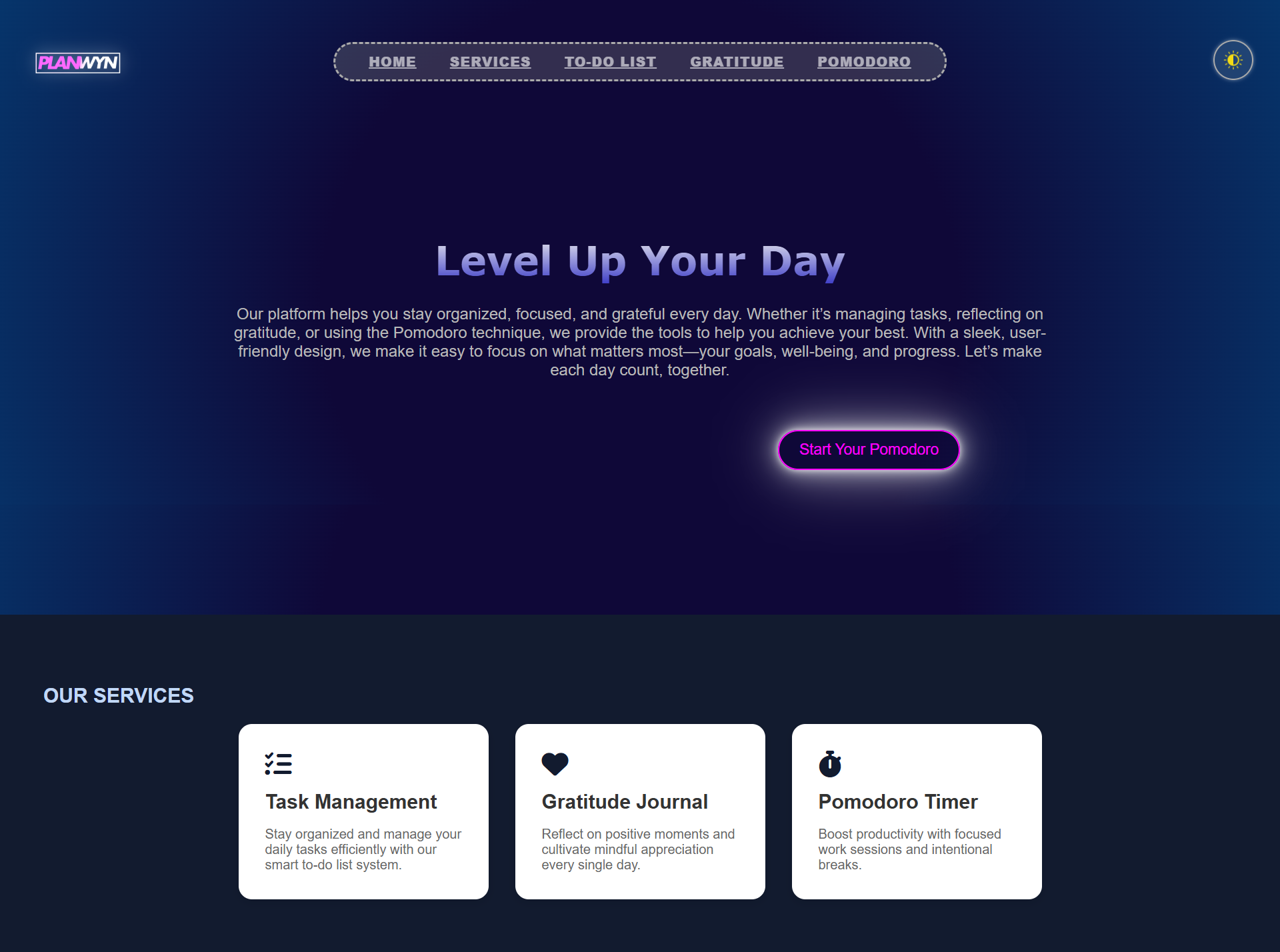 Productivity planner website with modern UI and responsive design.